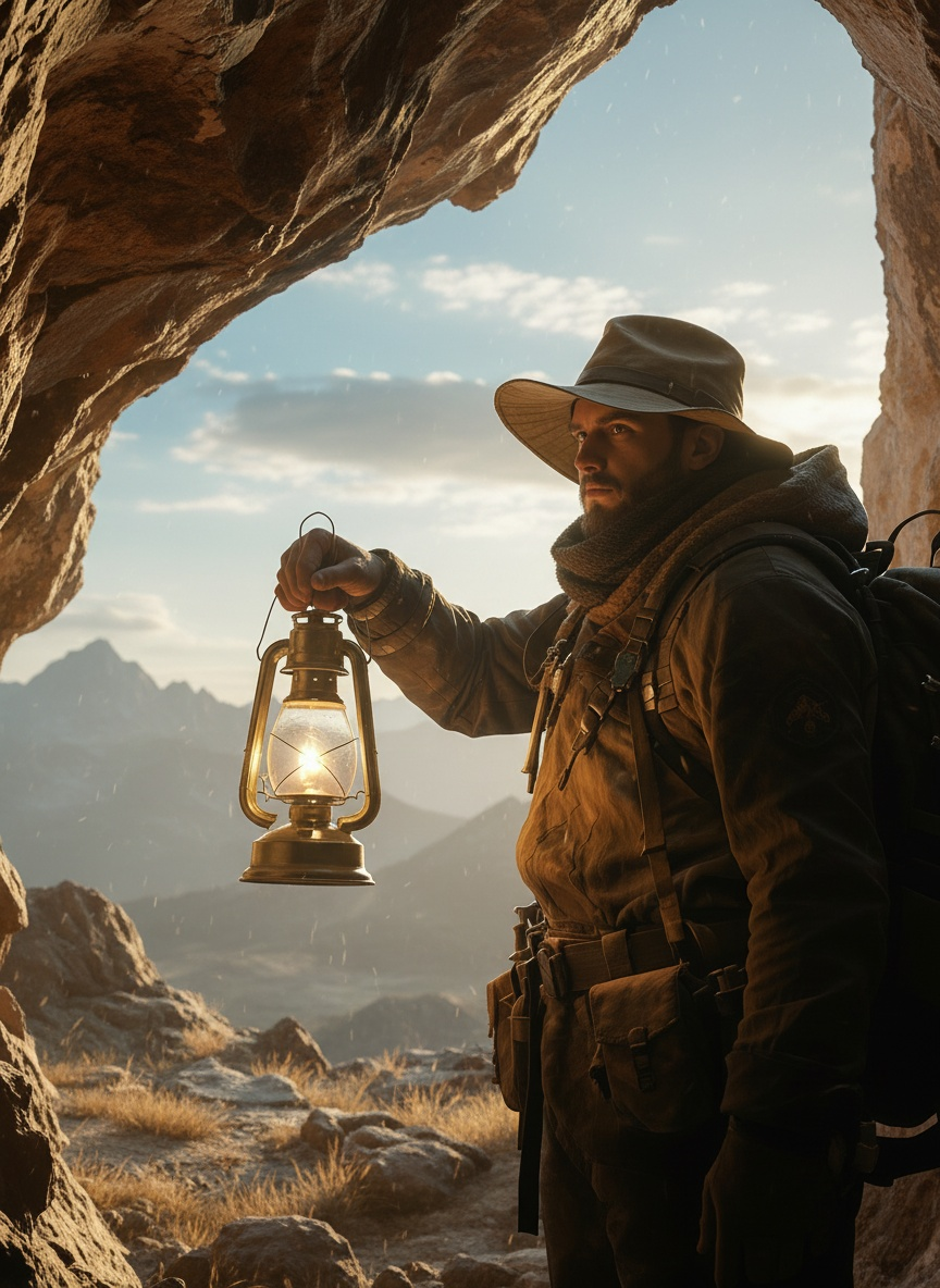 “The same explorer stepping out of a cave into soft golden daylight, mountains in the background.”