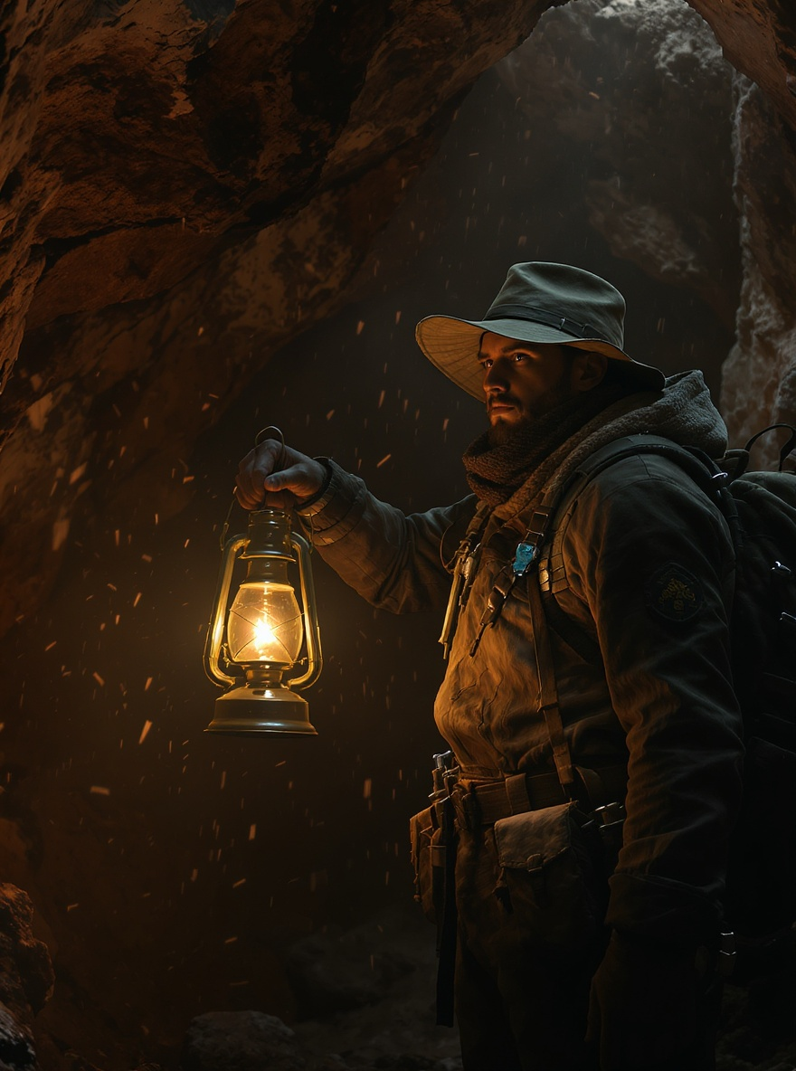 “A young explorer holding a lantern inside a dimly lit cave, dust particles in the air.”