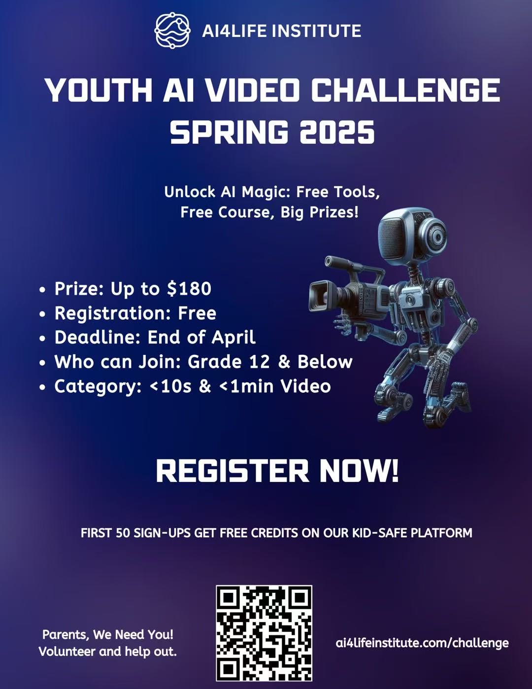 Registration Deadline: 4/15/2025! Don't miss this final chance to be part of the Youth AI Video Challenge—seize the opportunity and showcase your creativity!